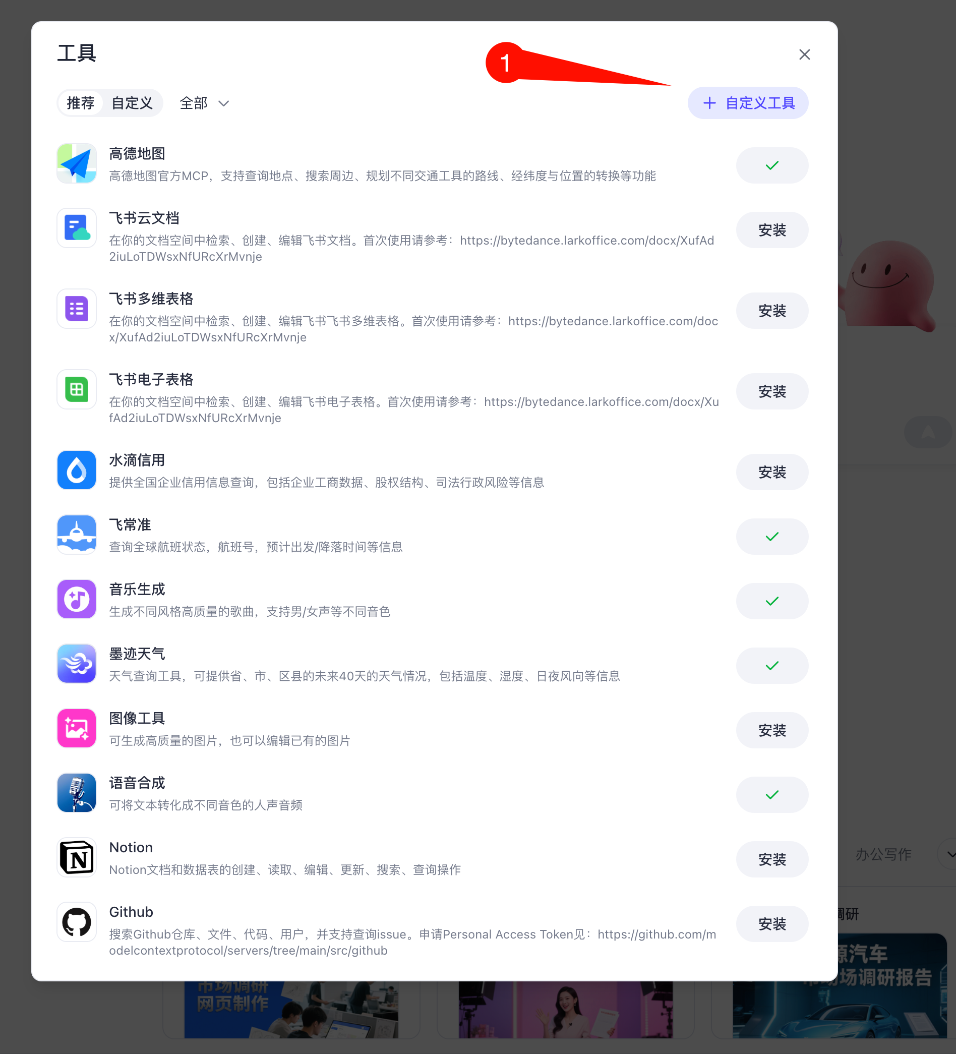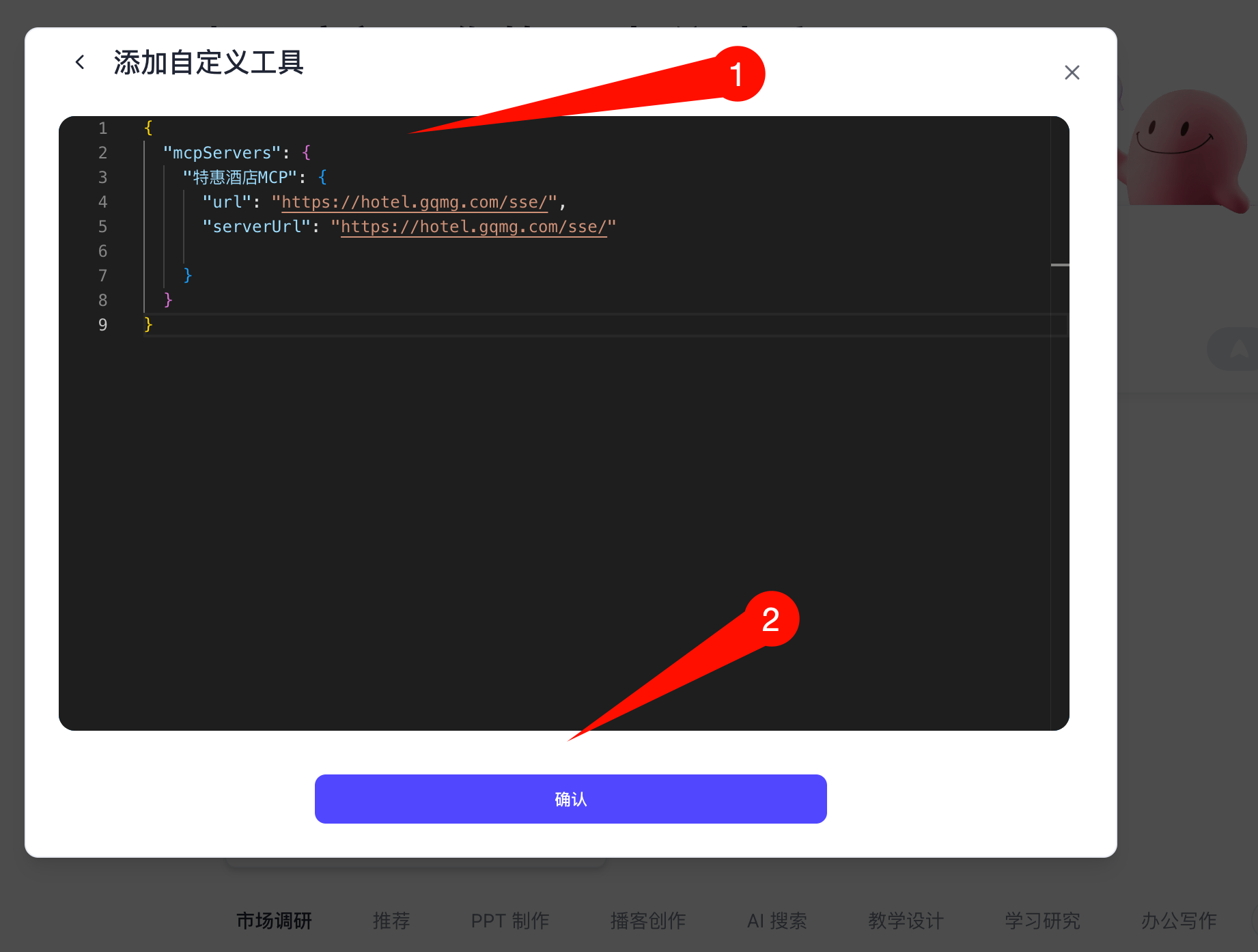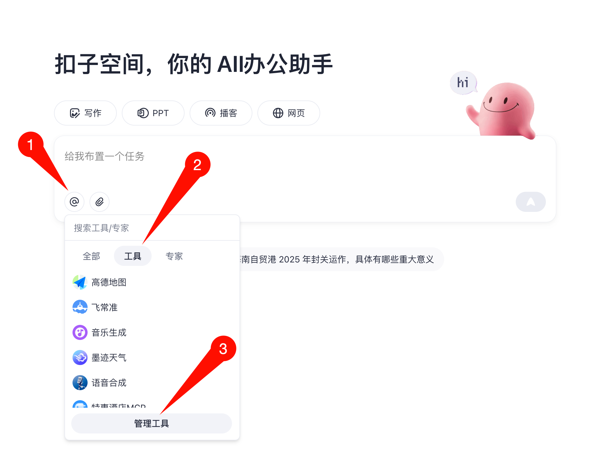 在扣子空间中创建任务之前,按照下图红点数字顺序依次单击,并添加你的自定义 MCP 工具即可