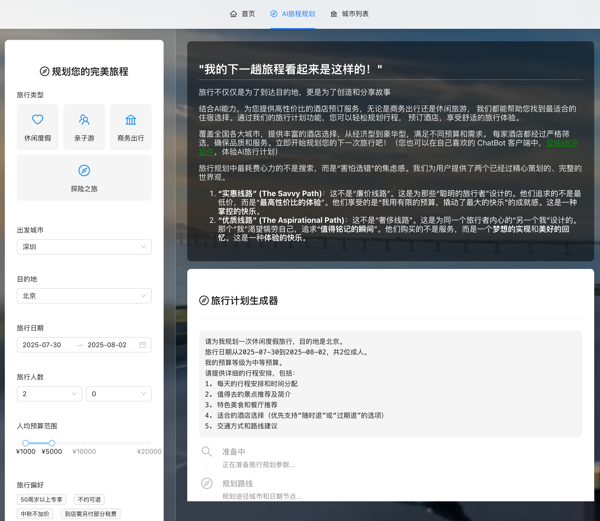 - 你的解决方案:每一条规划好的线路(途径城市+酒店选择),本质上都是一个旅行故事的剧本。用户可以清晰地看到这个故事将如何展开。